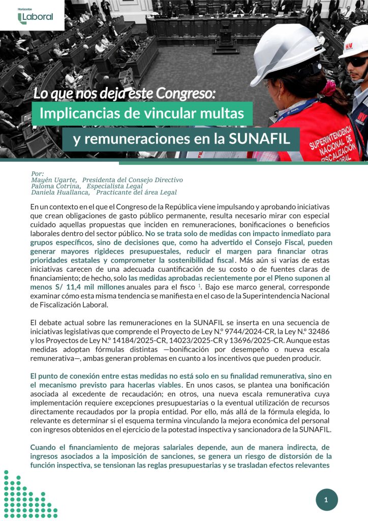 El informe analiza las implicancias de las iniciativas legislativas que buscan vincular mejoras remunerativas en la SUNAFIL con ingresos provenientes de multas, advirtiendo que este enfoque genera riesgos fiscales, institucionales y económicos. Sostiene que, aunque se presenten como bonificaciones o nuevas escalas salariales, estas medidas comparten un problema de fondo: crean incentivos que pueden distorsionar la función inspectiva al asociar el beneficio económico del personal con la capacidad sancionadora de la entidad. Además, señala que esto podría afectar la objetividad de la fiscalización, tensionar las reglas presupuestarias, invadir competencias del Ejecutivo y perjudicar especialmente a las micro y pequeñas empresas, al reforzar una lógica punitiva en lugar de promover la formalización y el cumplimiento laboral.